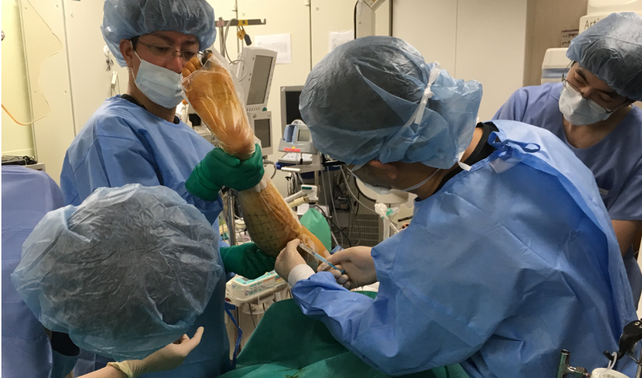 - 自己血から分離、培養したCD34陽性細胞を全身麻酔下で虚血肢に注射器で注入します。