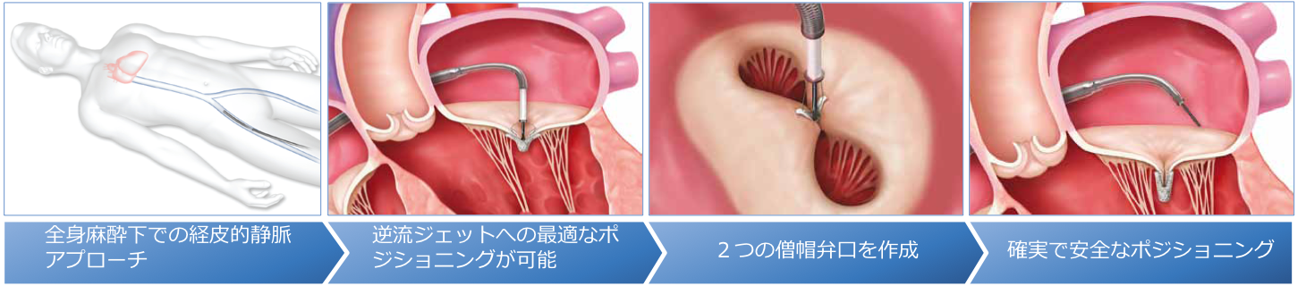- これまでは外科手術が困難で治療を受けることができなかった方を対象として、より低侵襲なカテーテルによるアプローチで僧房弁の修復を行う治療です。