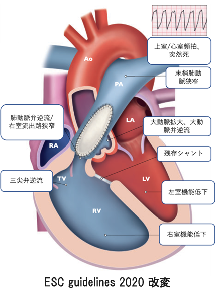 図1 :術後遠隔期で出現してくる多くの続発症(肺動脈弁逆流、不整脈、大動脈拡大など)