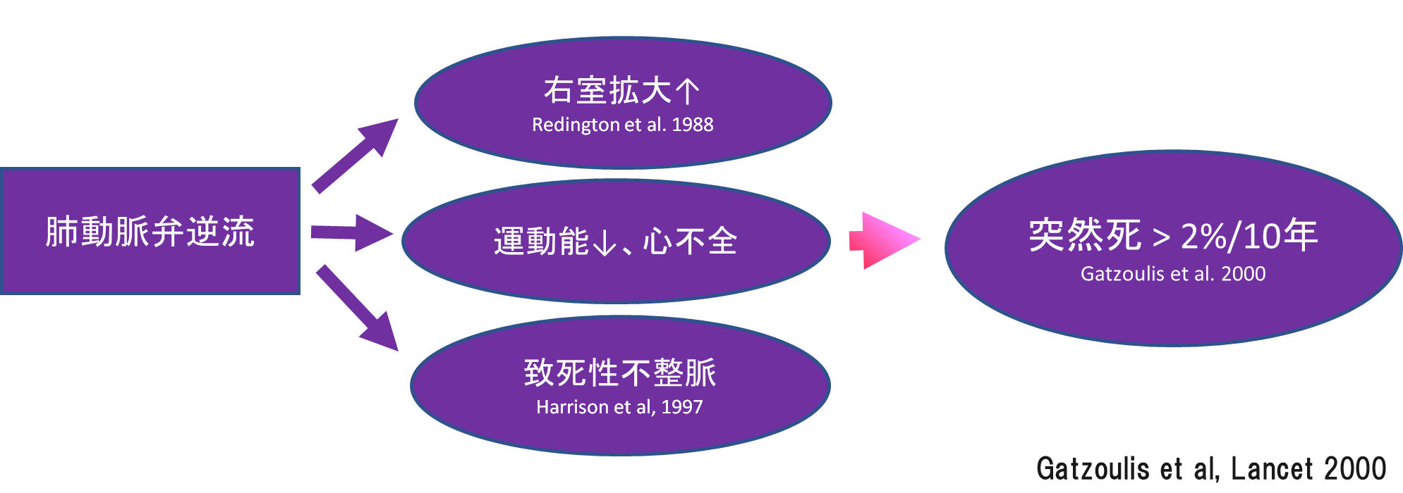 図3:肺動脈弁逆流から突然死へ。20-30歳代の患者さんが突然死リスクに晒されている。