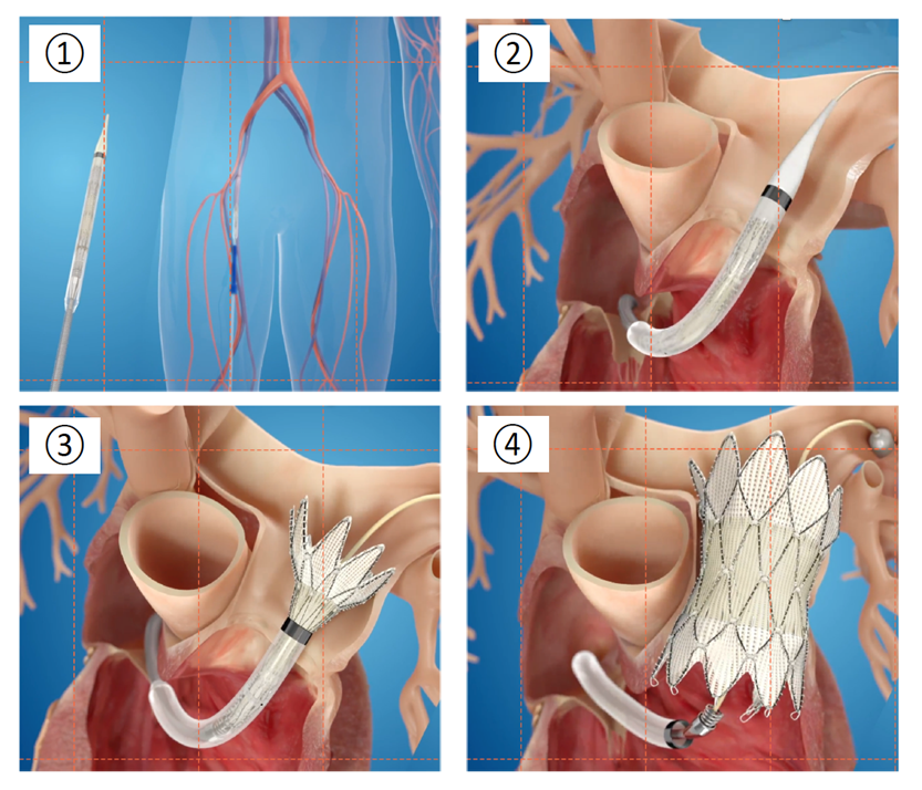 ①カテーテルにステント弁を畳み入れ、鼠径部から挿入。