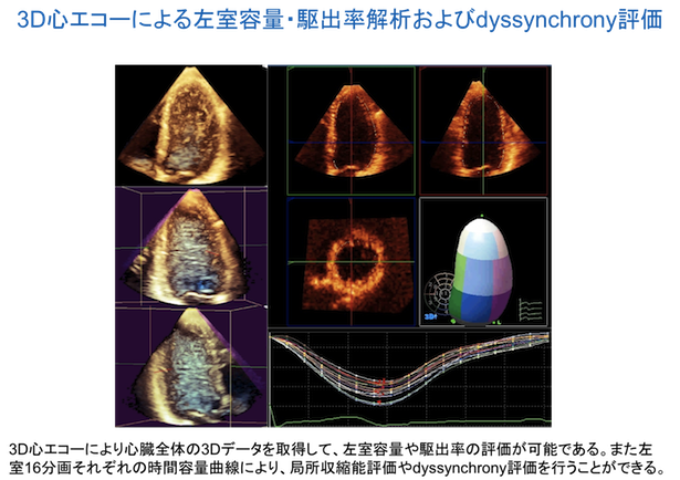 近年では組織ドプラ法やスペックルトラッキング法が開発され、心臓の詳細な情報を得ることが可能となっています。またリアルタイム3D心エコーにより、立体的な心臓の形態や動きも捉えることができるようになりました。