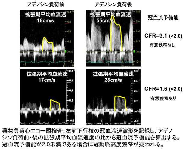 またアデノシン負荷前後の冠動脈血流速度を計測し冠動脈狭窄を推定します。さらに、安静時に既に虚血や梗塞によって心筋の壁運動低下を認める心筋については、ドブタミン負荷を行うことによって、心筋バイアビリティ(生存能)を評価することが出来ます。