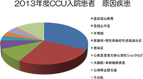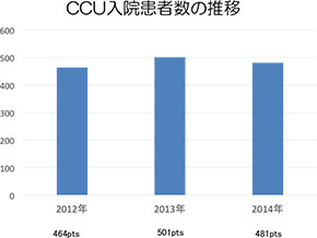 別図に示す通り、現在ではCCU入室の原因として虚血性心疾患が約1/3、急性心不全が約1/3、その他が約1/3を占めている状況で、 入院患者数も年々増加傾向にあります。