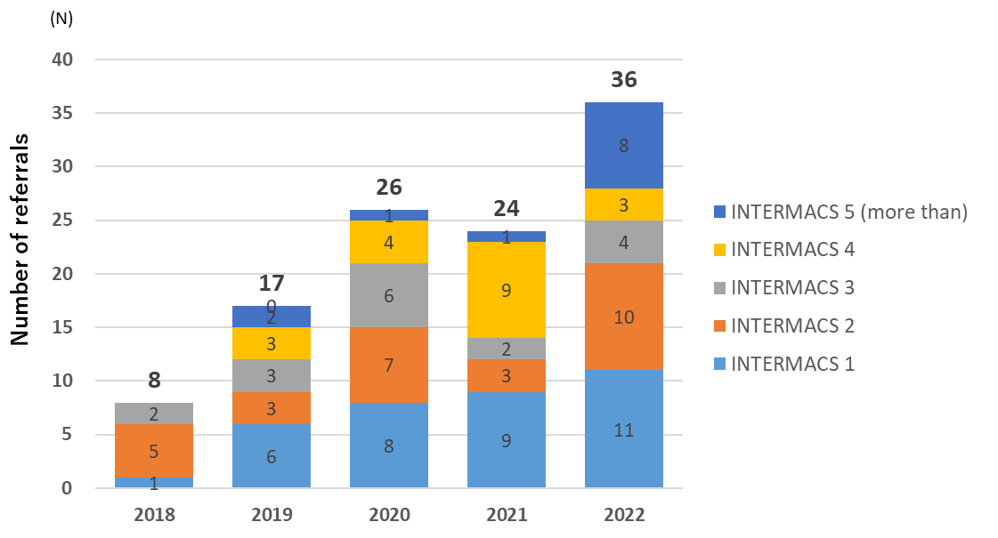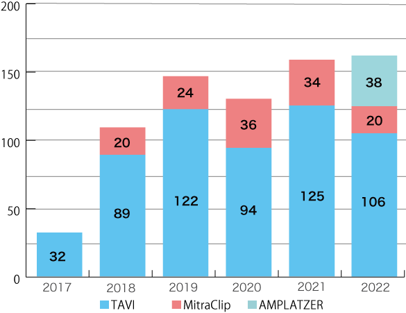 構造的心疾患(SHD)インターベンションは重症大動脈便狭窄症に対する経カテーテル大動脈弁留置術(TAVI)、 重症僧帽弁閉鎖不全症に対する経皮的僧帽弁形成術(MitraClip)を国内施設では先駆けて積極的に行っており、治療数は近年大幅に増加しております。